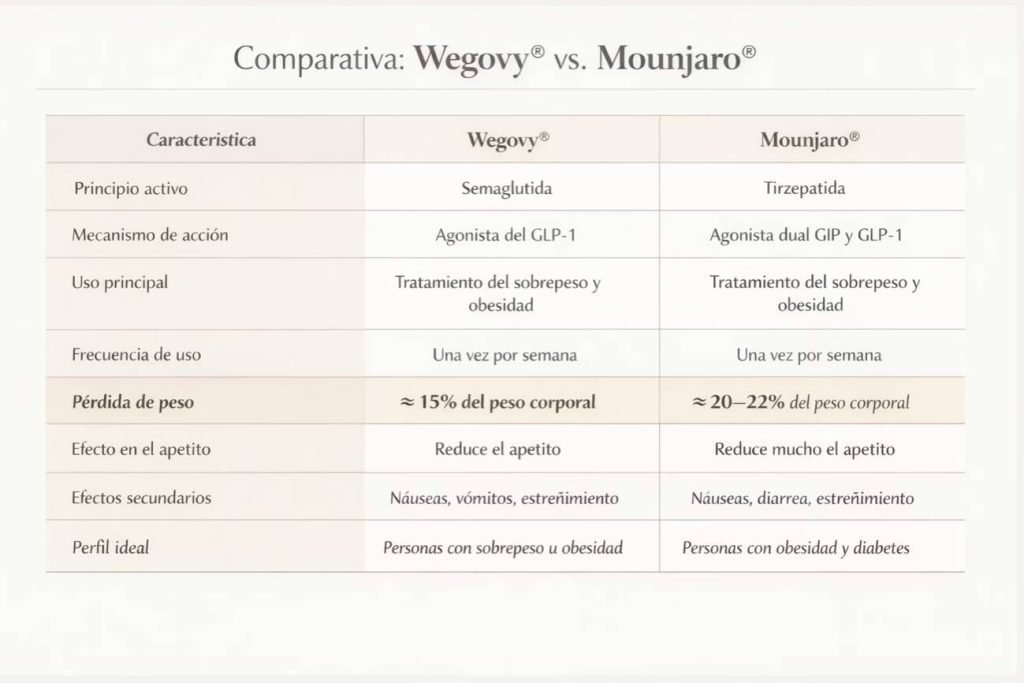 - Mounjaro (tirzepatida): es un fármaco de «doble acción». No solo imita al GLP-1, sino también a otra hormona llamada GIP. Esta combinación potencia el control de la saciedad. Es como si Wegovy tuviera un motor y Mounjaro tuviera dos, lo que suele traducirse en una pérdida de peso ligeramente superior en los estudios clínicos.
